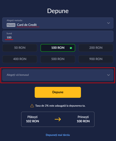 ATENȚIE: Bonusurile cu depunere sunt disponibile exclusiv pentru depunerile realizate cu card bancar și nu se aplică pentru depunerile efectuate prin PaySafeCard, Aircash sau Voucher Abon.