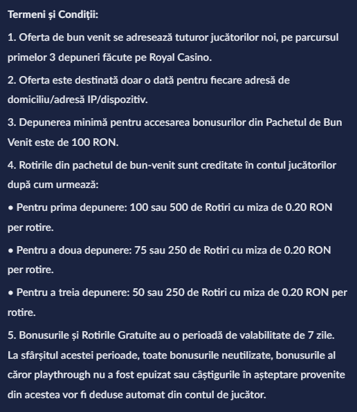 Ai secțiunea de Termeni și Condiții afișată, în care regăsești și un link către pagina de Termeni și Condiții Royal Slots.