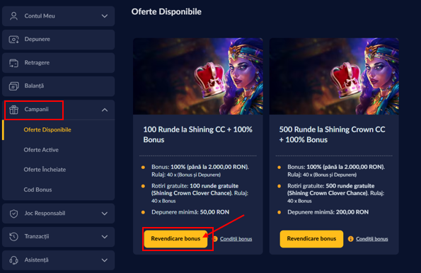 Selectează oferta dorită din cele regăsite în secțiunea "Bonusurile mele", apăsând butonul "Revendică".