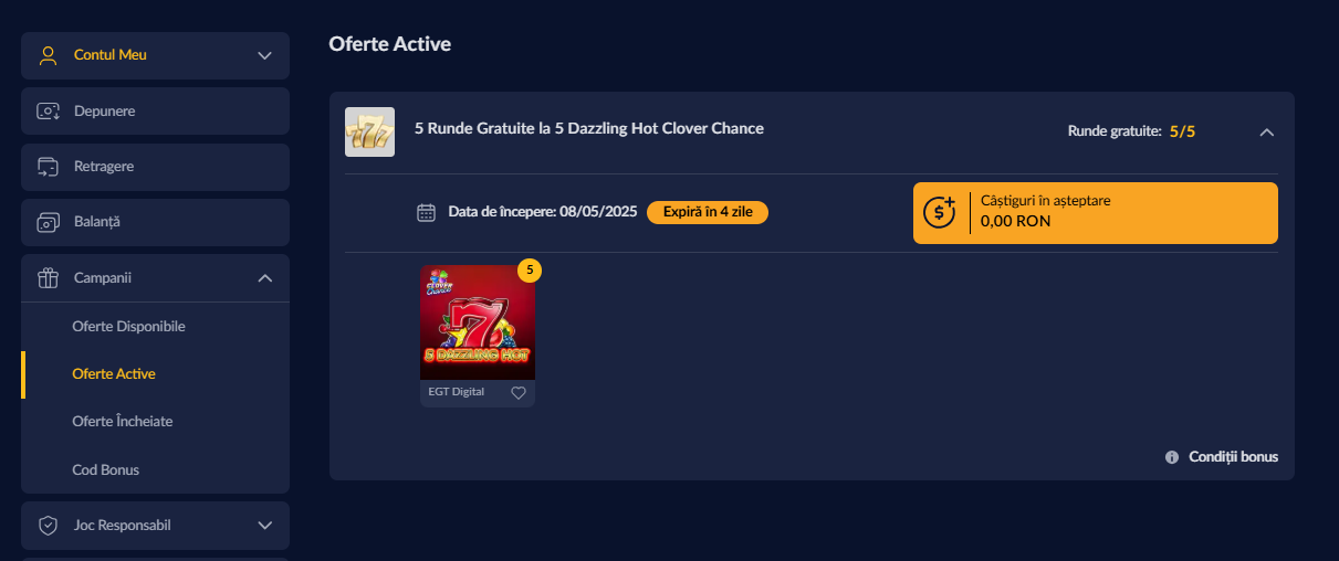 Toate bonusurile active pot fi vizualizate accesând butonul "Bonusuri active". Pentru fiecare bonus în parte, poți accesa detalii suplimentare apăsând pe bonusul respectiv. În cazul în care bonusul include runde gratuite, jocul pentru care acestea sunt valabile va fi afișat în aceeași secțiune și poate fi accesat direct printr-un simplu click.